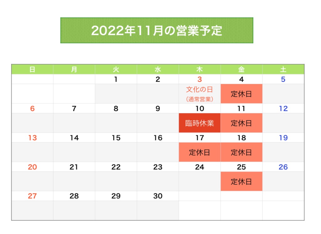 11/3(祝)は第1木曜日ですが休日のため通常営業いたします。