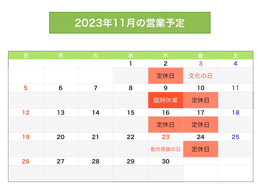 2023-10-31 11月の営業予定 gallery 11/3は金曜日ですが祝日のため通常営業いたします。 11/9は臨時休業いたします。 ※ギャラリーは現在笠間焼手洗いボウルのご購入、ご相談のみ対応しております。なおご来店のお時間(特に昼時)によっては対応できない場合、不在の場合等がありますので出来るだけ下記にご予約をお願いいたします。09061194343(高瀬)